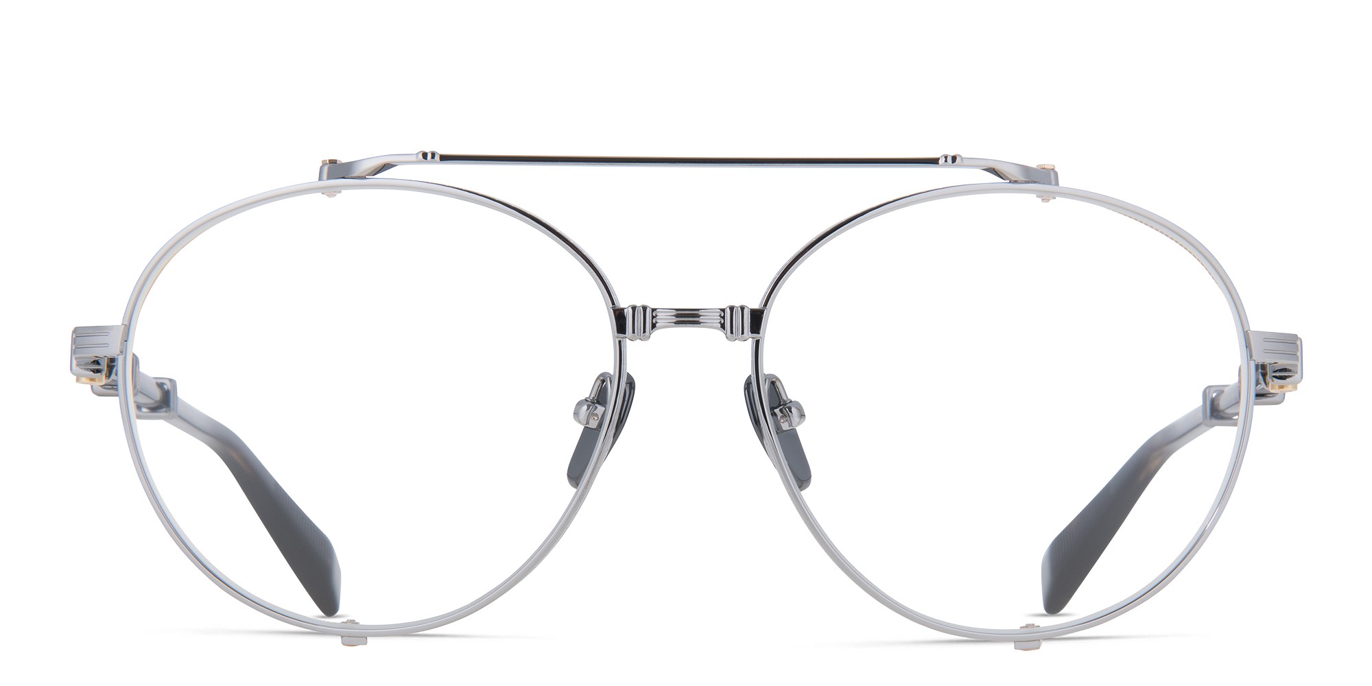 Crafted from a Japanese titanium frame and stainless steel Brigade side shields, these round, unisex Balmain eyeglasses in silver feature intricate metal detailings that recall the beauty and precision of architectural patterns the brand's Japanese artisans pass by every day. For an unexpected pairing with those elegantly precise geometries, Olivier Rousteing has channelled the ‘80s pop vibe'.